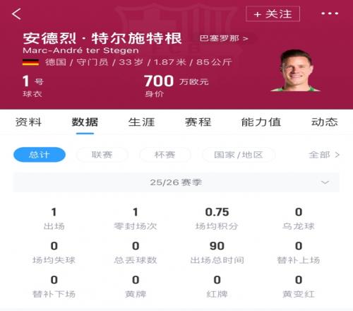 特尔施特根现年33岁,他本赛季仅为巴萨出场1次,现德转身价700万欧,他与巴萨的合同在2028年到期。
